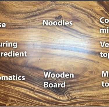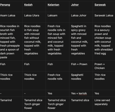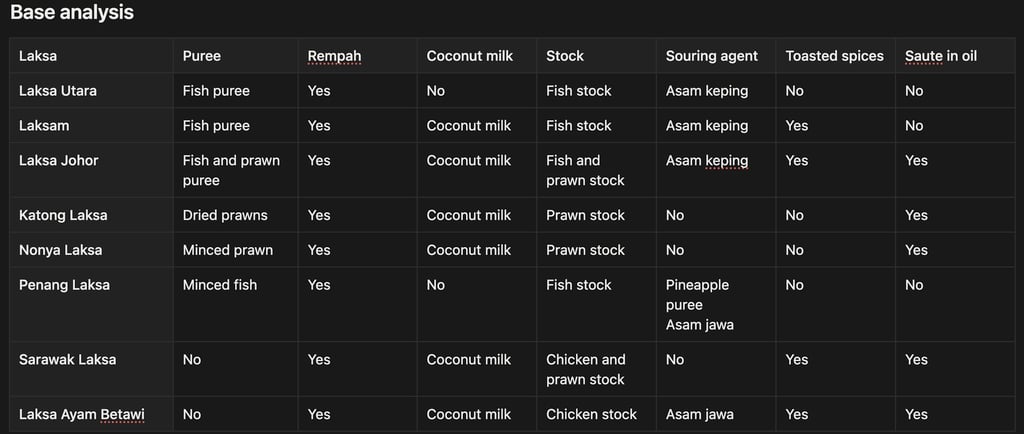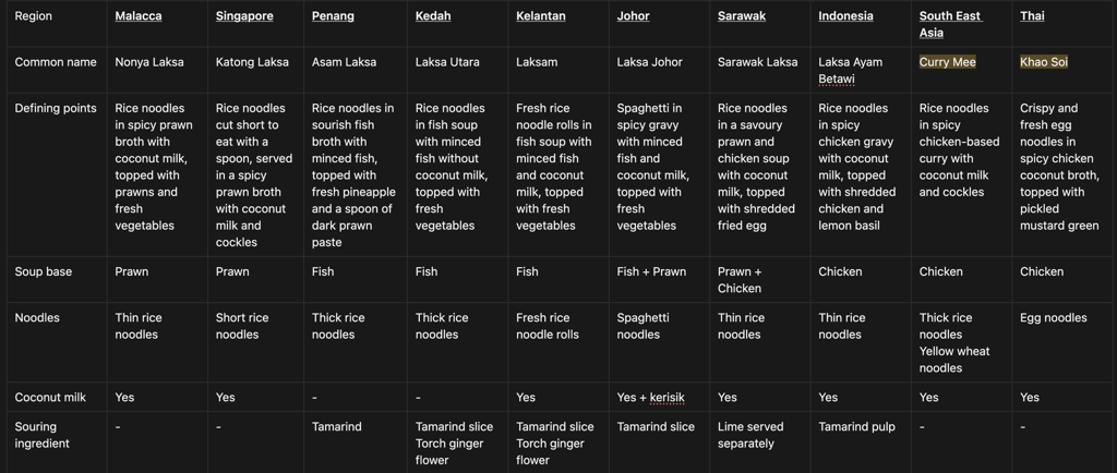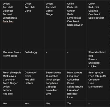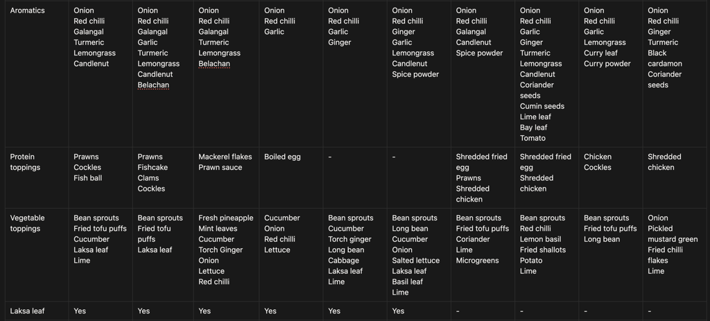 This is a matrix table of laksa ingredients to see how ingredients are transformed to the final dish. It also lets us analyse across the different types of laksa on the ingredients, base components, and toppings. (Note: I forgot to take a pic for Katong laksa, hence I reused Nonya laksa one. It's about the same, except that there should be fishcake...)