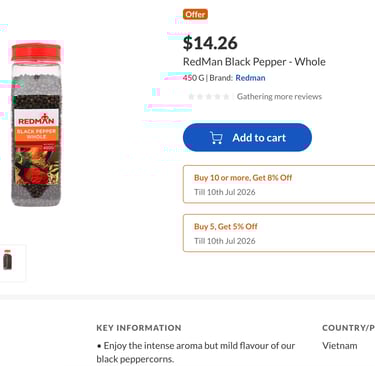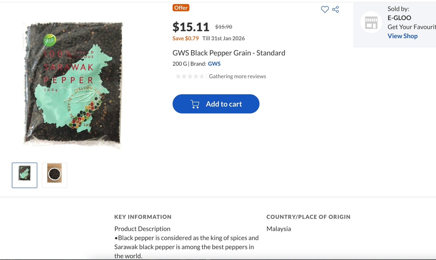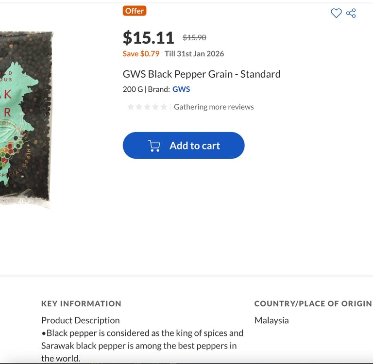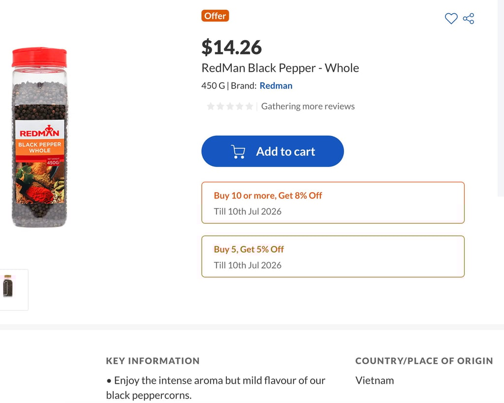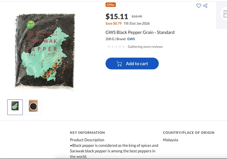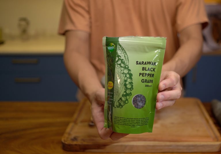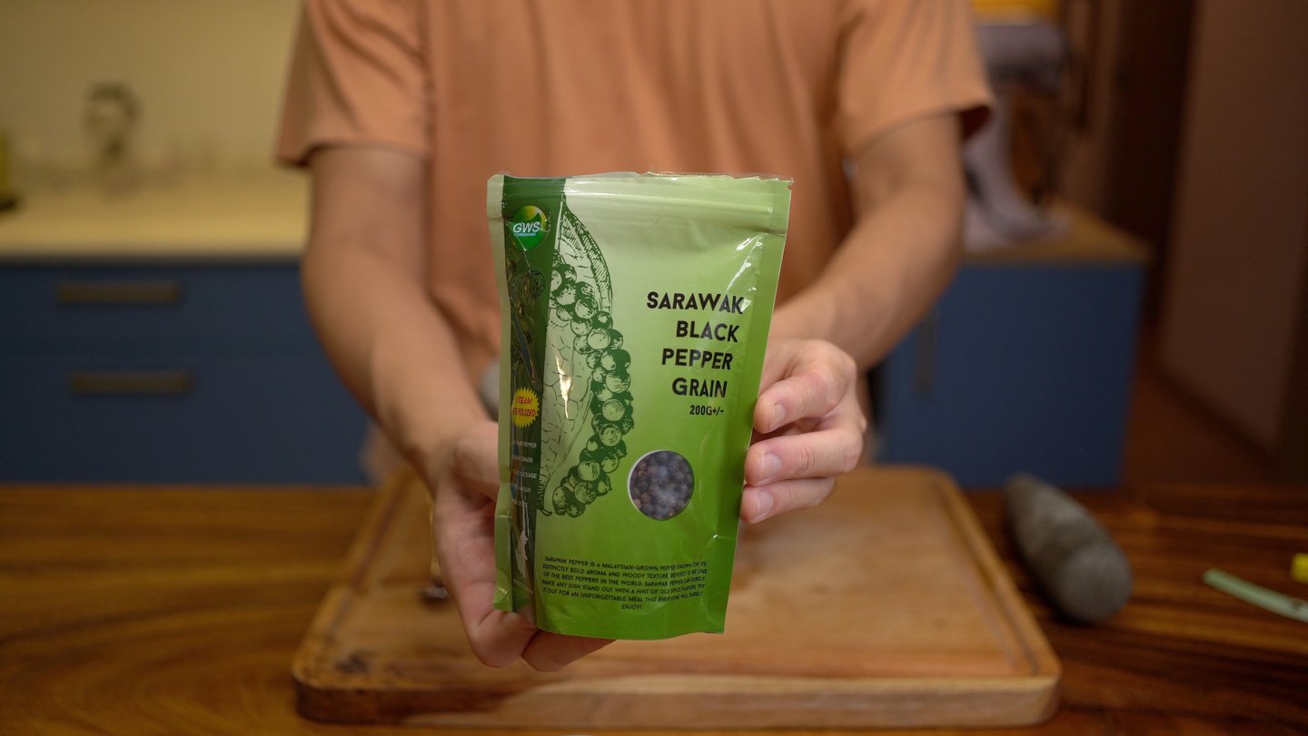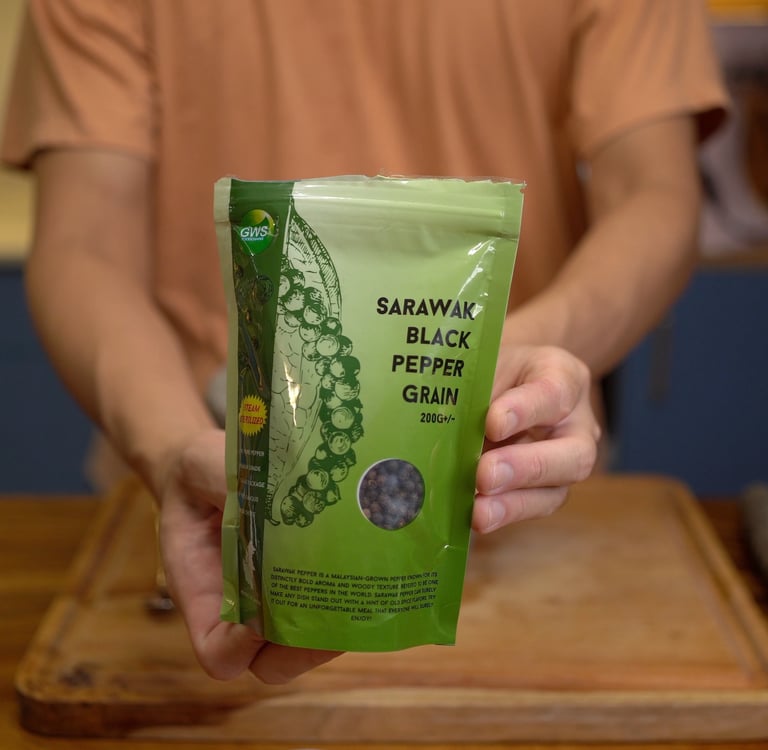 I got this one from NTUC online (not available in stores) to ensure it's authentically from Sarawak. It costs like $60 per kg whereas a normal black pepper only goes like $28 per kg. But the Sarawak pepper is truly more aromatic and just a little bit already tastes way more peppery than the normal one which tastes light in comparison.