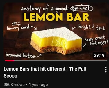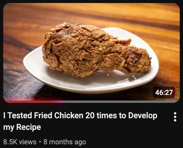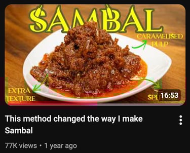 Thumbnails should be inspired by trending thumbnails of other creators that I admire and look up to. It should present food in a glorious way to entice people to learn more about it.Titles